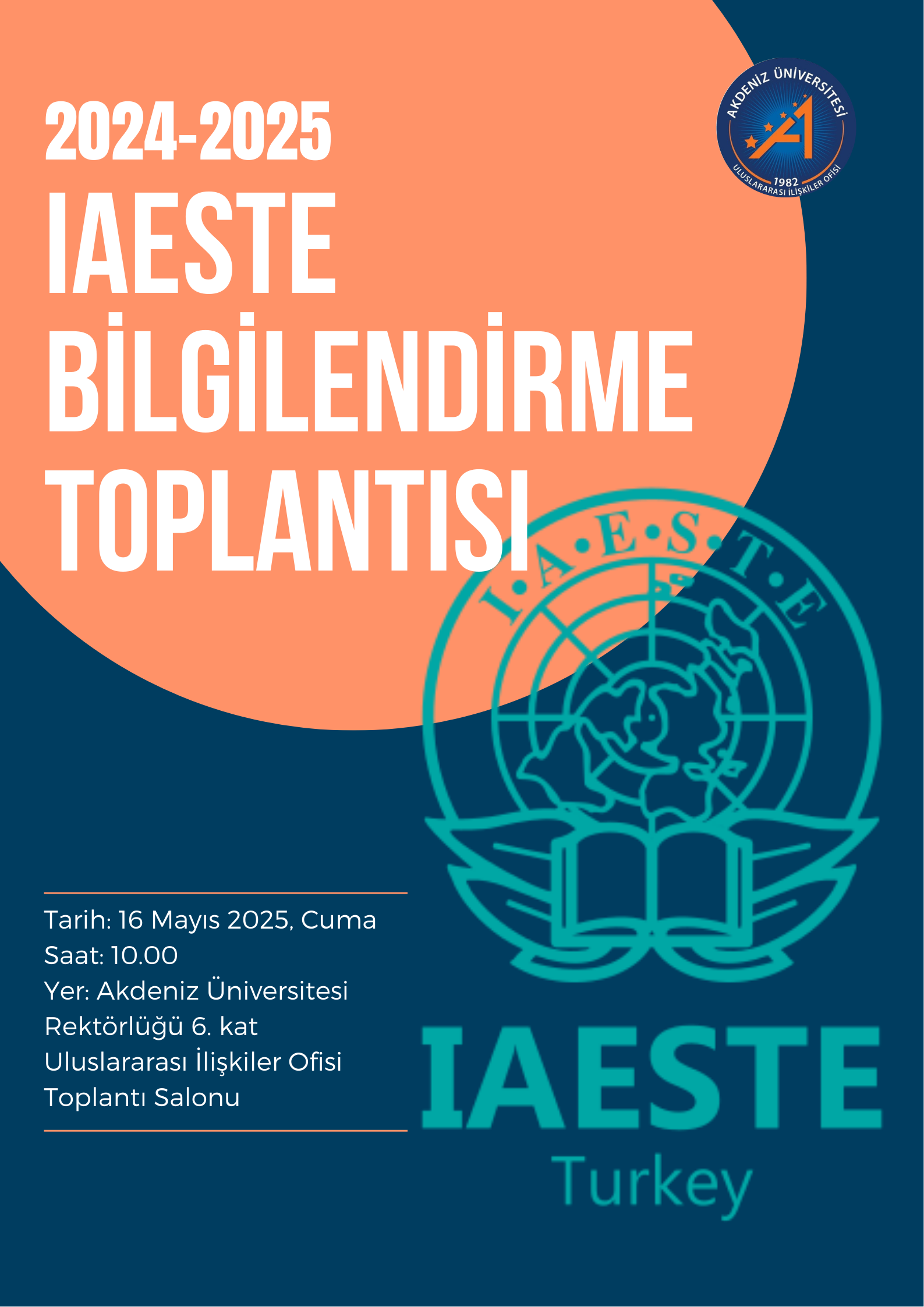 2024-2025 eğitim – öğretim yılı IAESTE programının tanıtımı, başvuru süreci ve hazırlanması gereken Aday Öğrenci Belgeleri ile ilgili 16 Mayıs 2025 Cuma günü düzenlenecek olan bilgilendirme toplantısı afişi için tıklayınız.